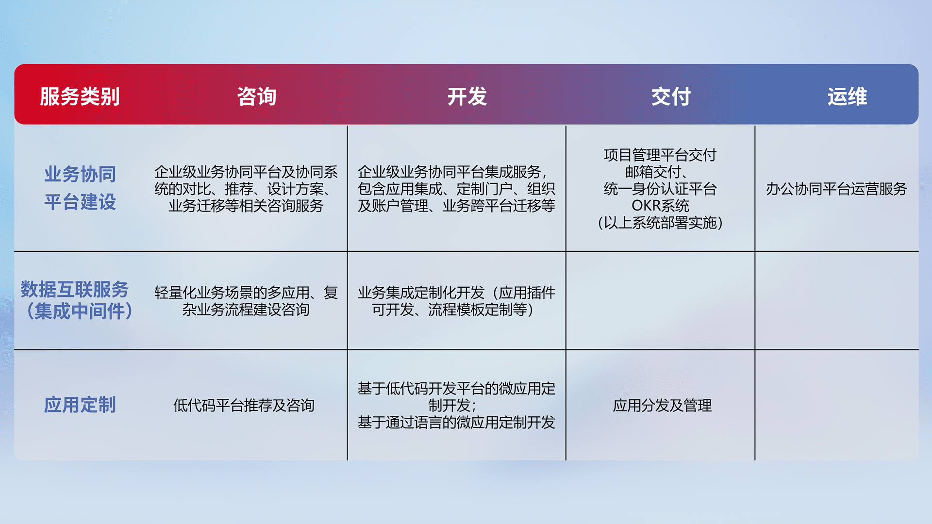 针对钉钉、、、企微、、、、IDaas等平台级产品提供产品的规划、、、、方案、、、交付、、、、定制化开发等服务,,实现如统一协同办公、、智能客户服务、、混合会议管理、、、智能数据查询、、等业务场景,,,,实现数字化转型。。。