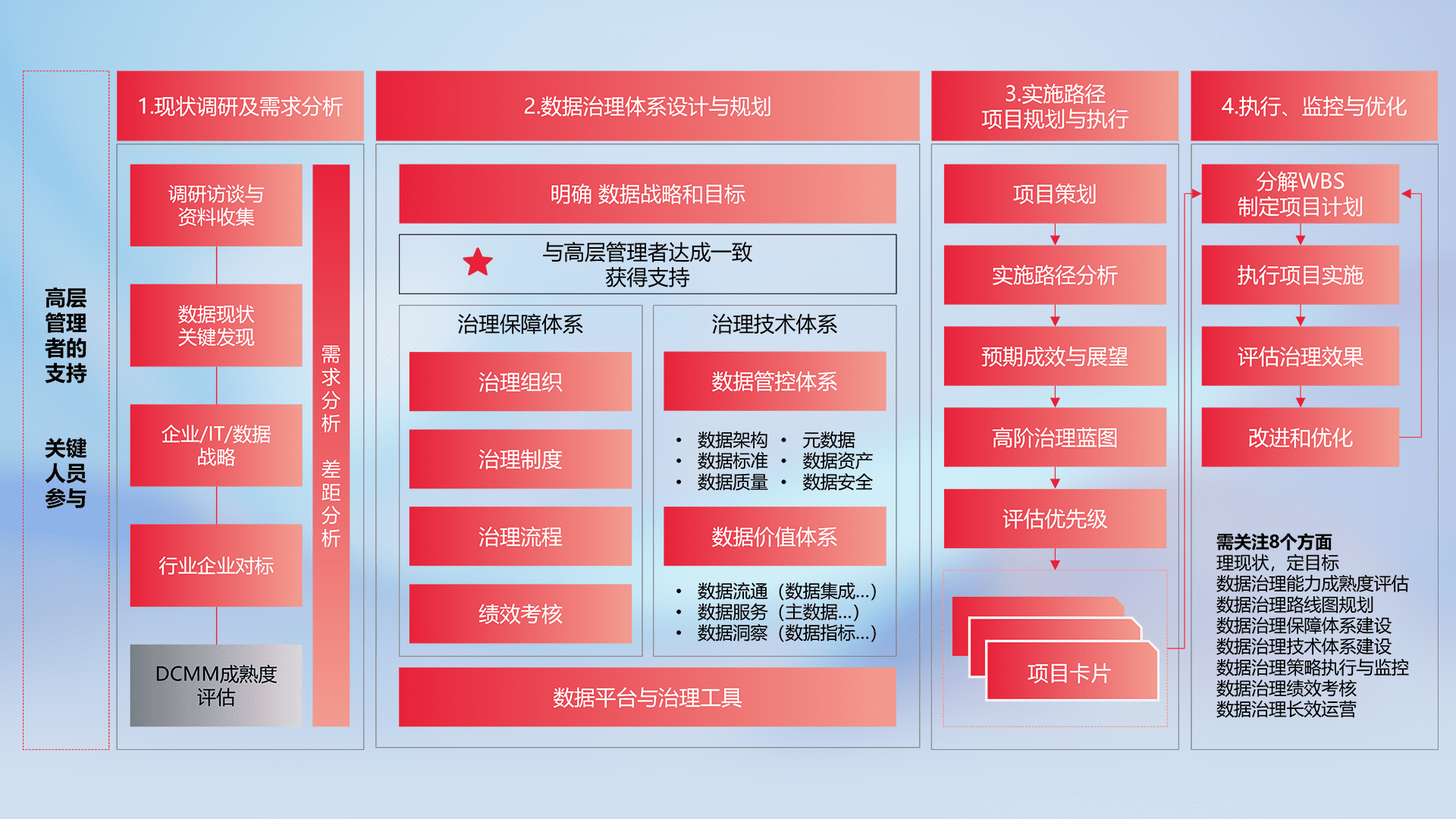 制定并执行统一的数据标准,,,规范数据定义和格式,,,,消除冗余和不一致性,,,,实现跨部门和跨系统的数据一致性,,,,为企业提供标准化的数据基础。。